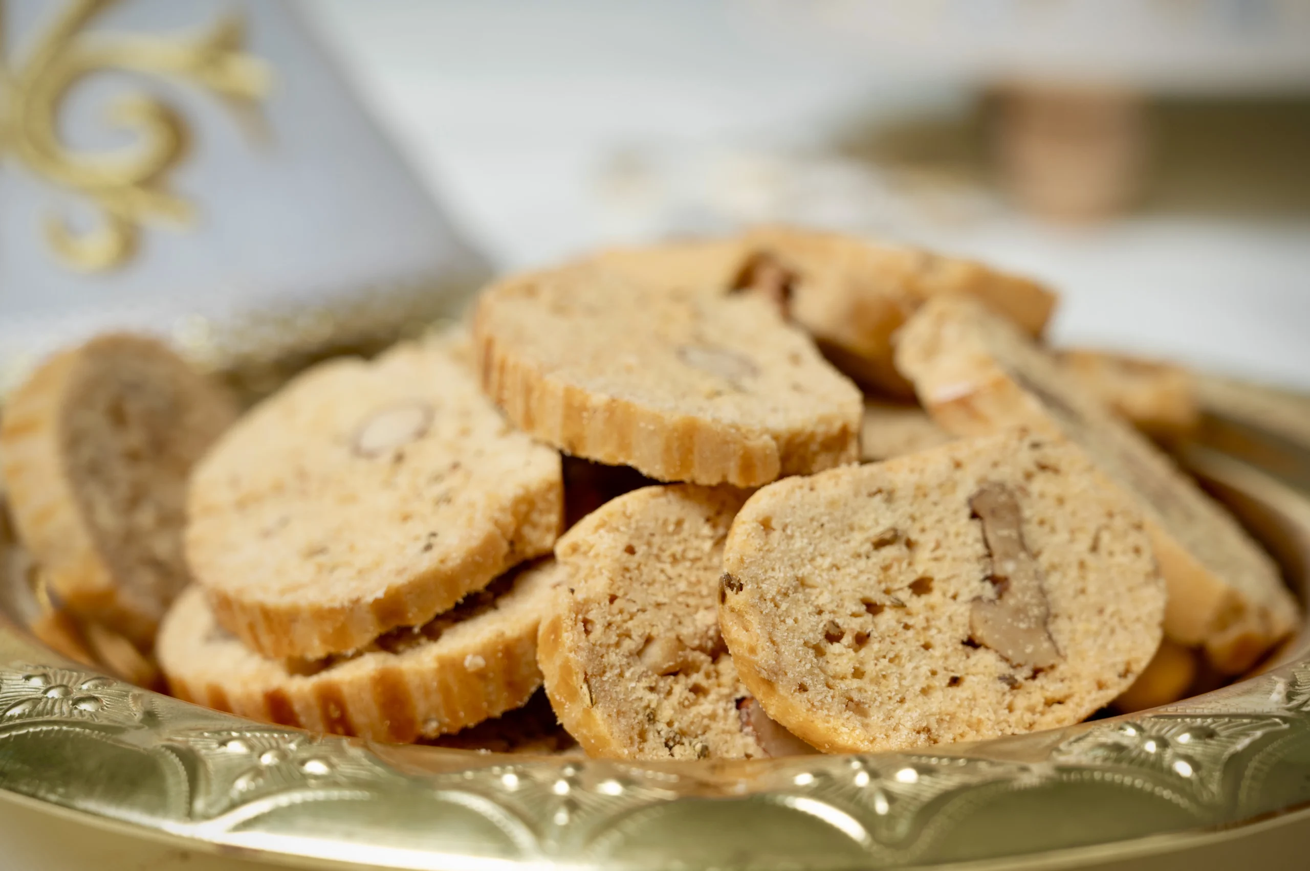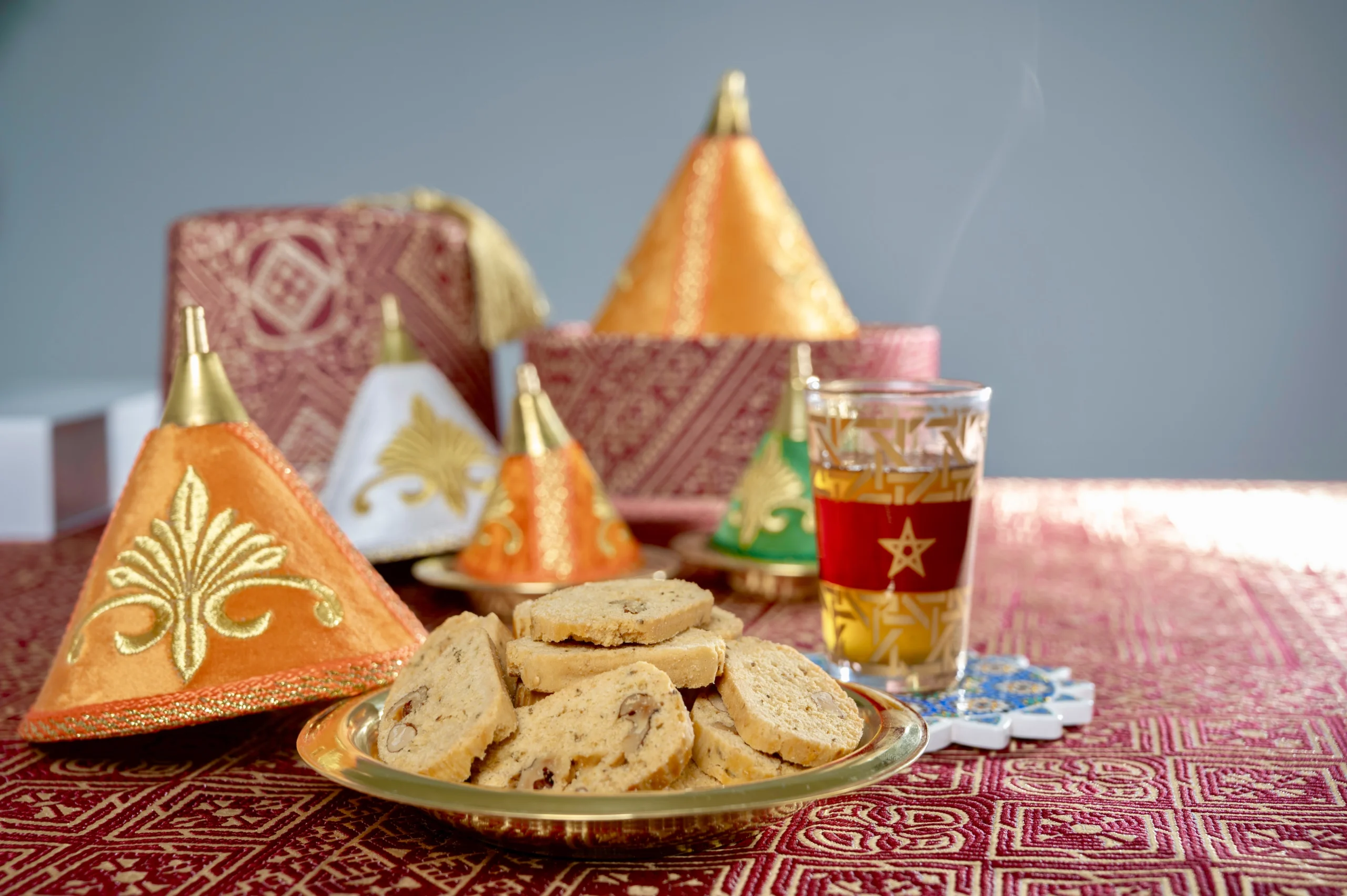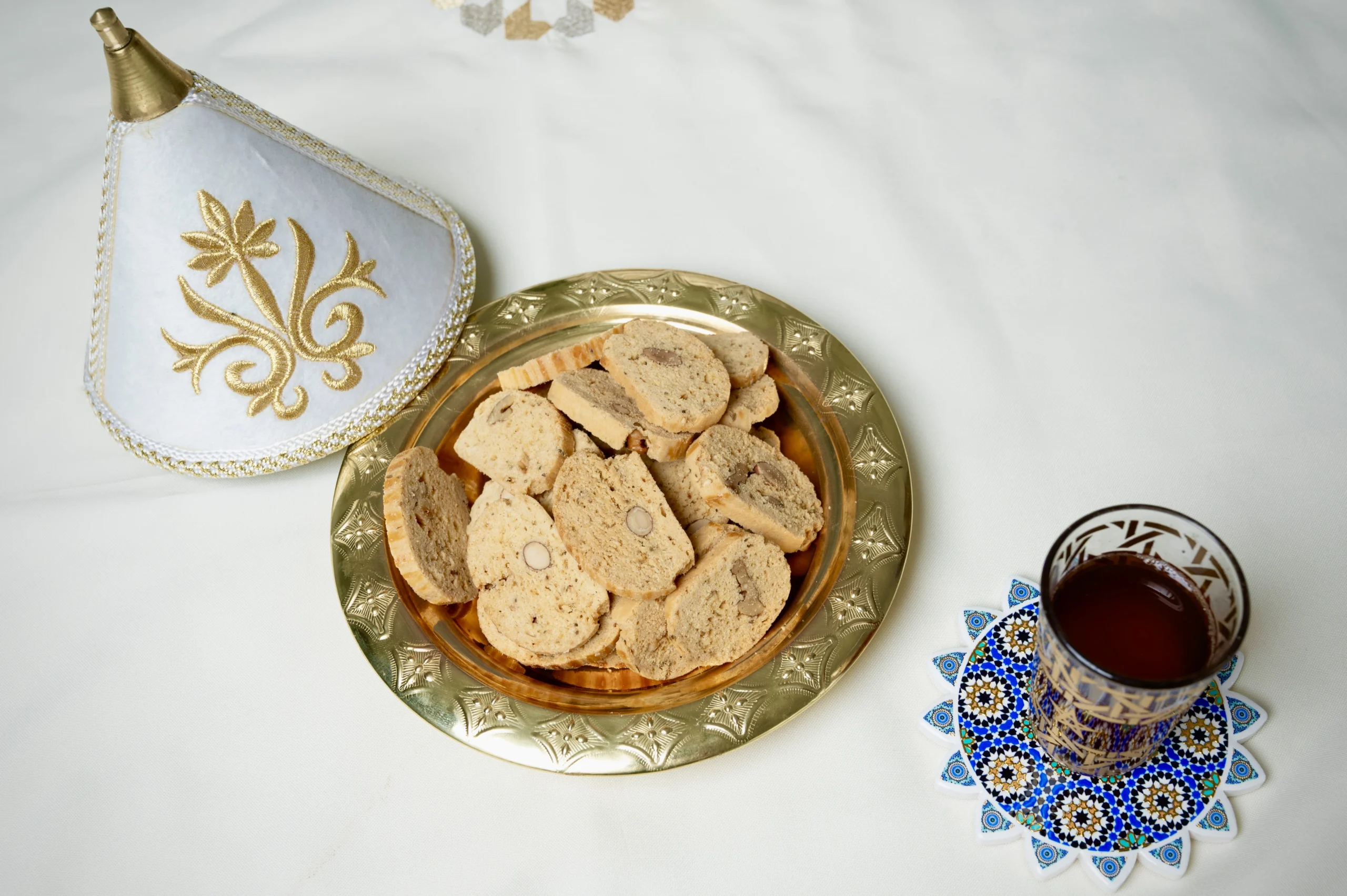 Fekkas are traditional Moroccan biscuits, often described as Moroccan-style biscotti. These crunchy treats are made with a blend of almonds, sesame seeds, and lightly spiced with anise or cinnamon. Their crisp texture and rich flavor make them the perfect companion for a cup of Moroccan mint tea, offering a delightful balance of sweetness and crunch.