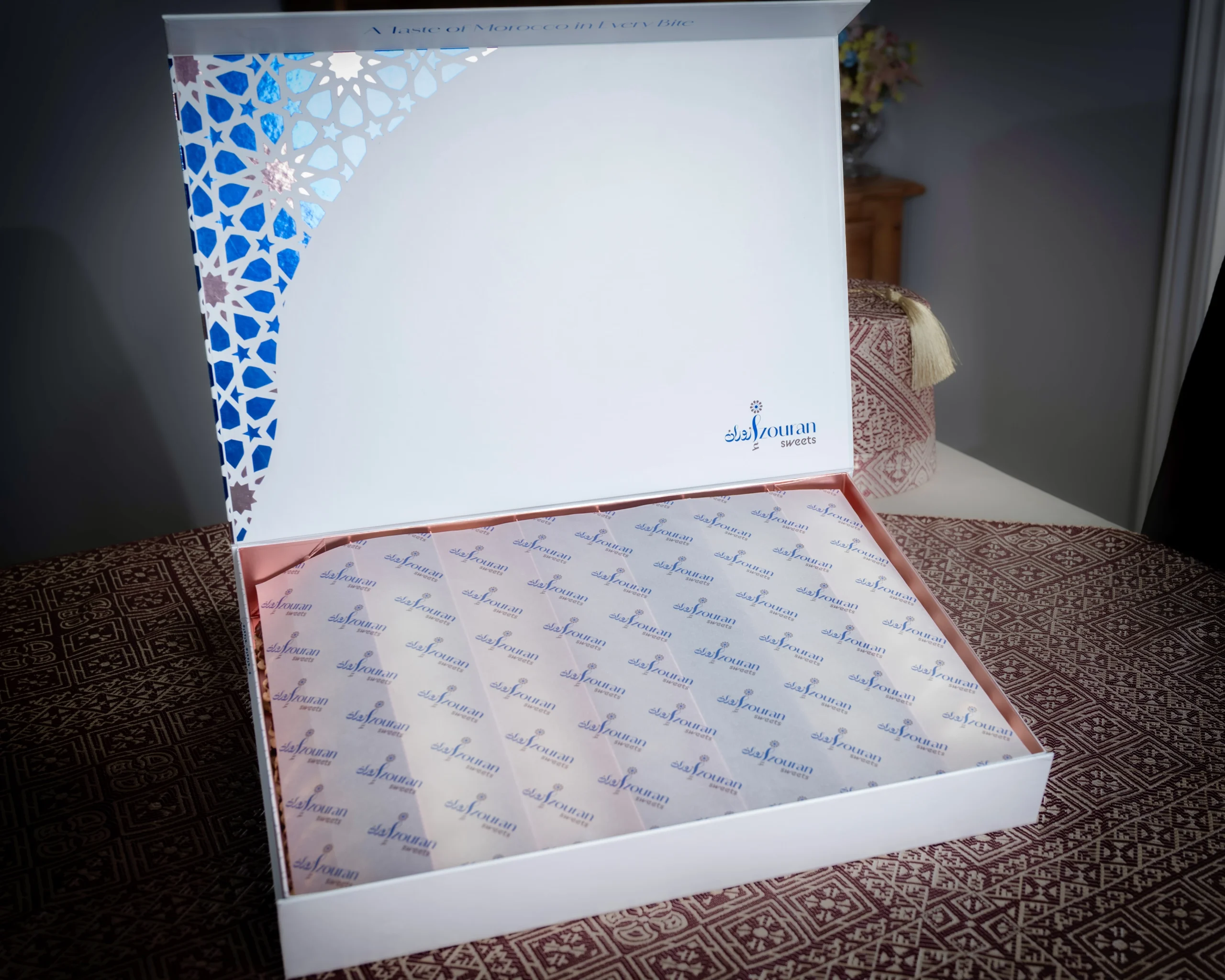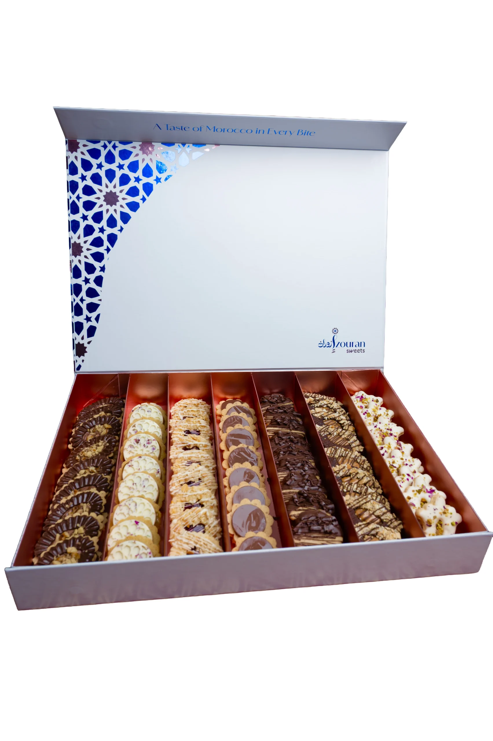 Indulge in a beautifully curated box of 63 artisanal Moroccan sweets, blending tradition and creativity. Each box includes 3 unique collections: almond-based classics, buttery sablés, and modern fusion bites — all handcrafted with premium ingredients, perfect for gifting or sharing over tea.