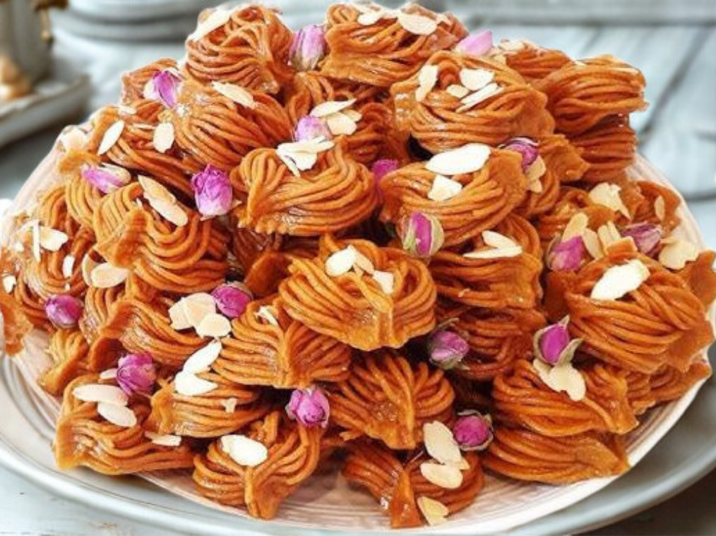 Bechnikha is a traditional Moroccan pastry made with a soft almond filling, lightly sweetened with honey, and flavored with a blend of aromatic spices. Its melt-in-the-mouth texture makes it an irresistible dessert, often served during special occasions like weddings and Ramadan.