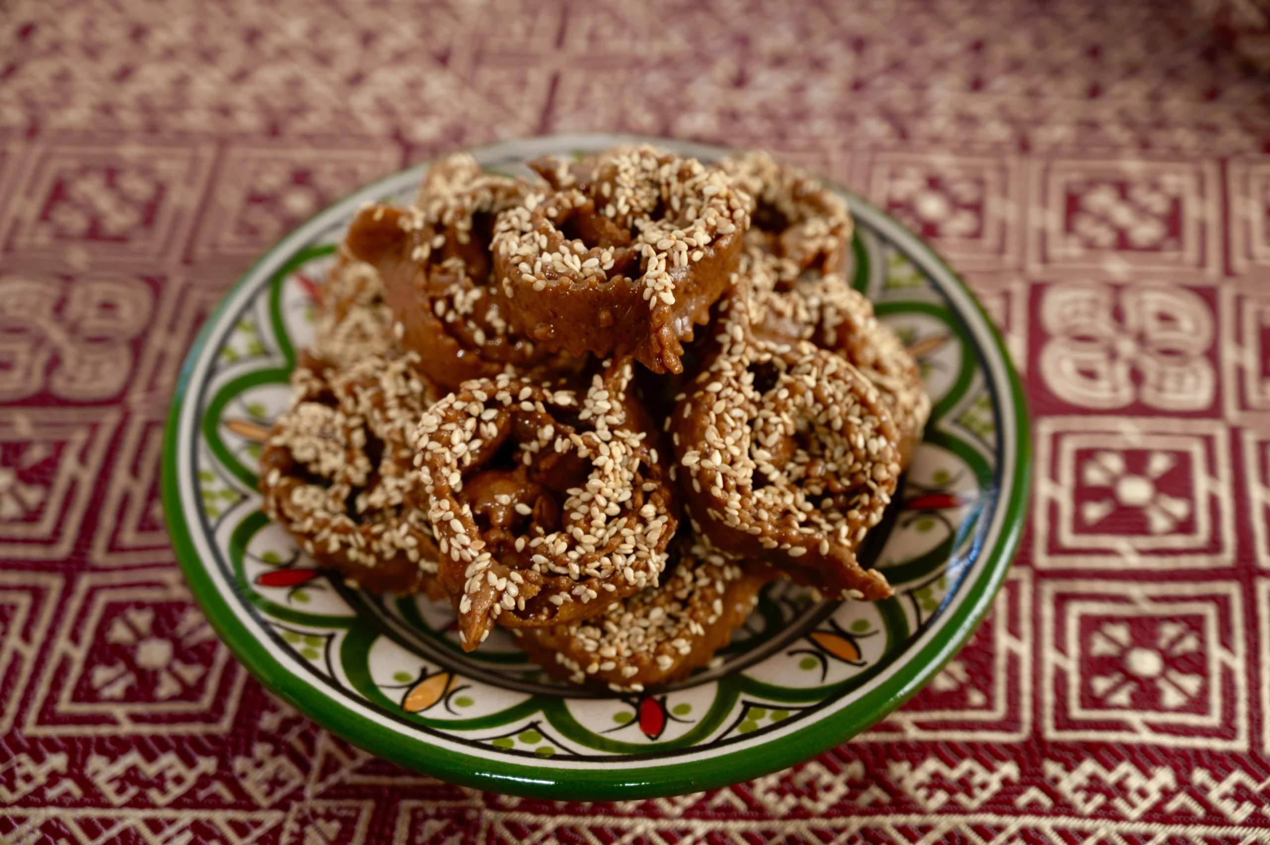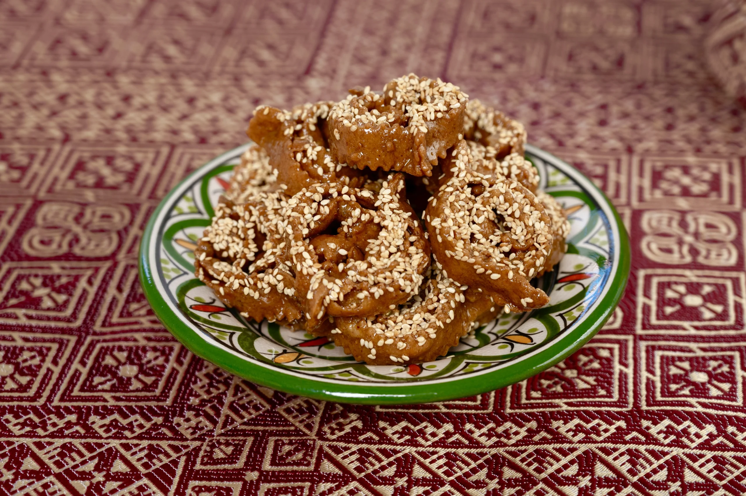 Chebakia, also known as Mkharqa, is a beloved Moroccan pastry that embodies the essence of Moroccan tradition and hospitality. Made from a delicately spiced dough infused with anise, cinnamon, and orange blossom water, these flower-shaped delights are fried to golden perfection and coated in rich honey and toasted sesame seeds.