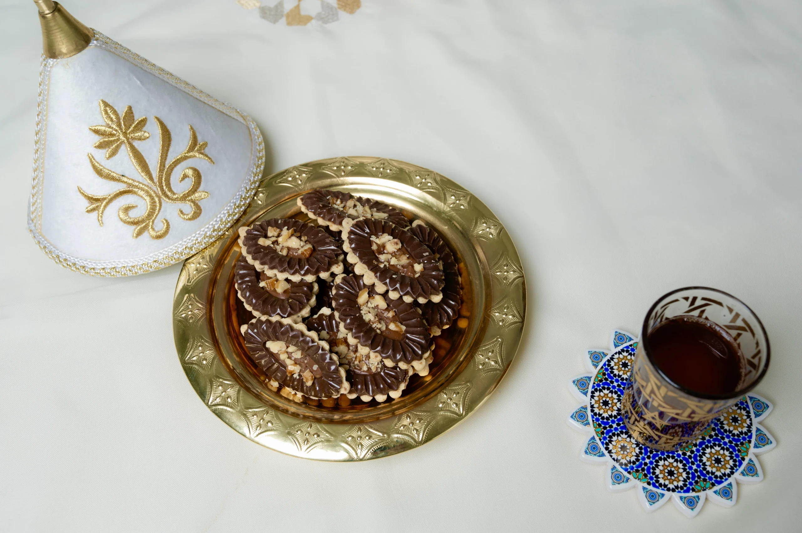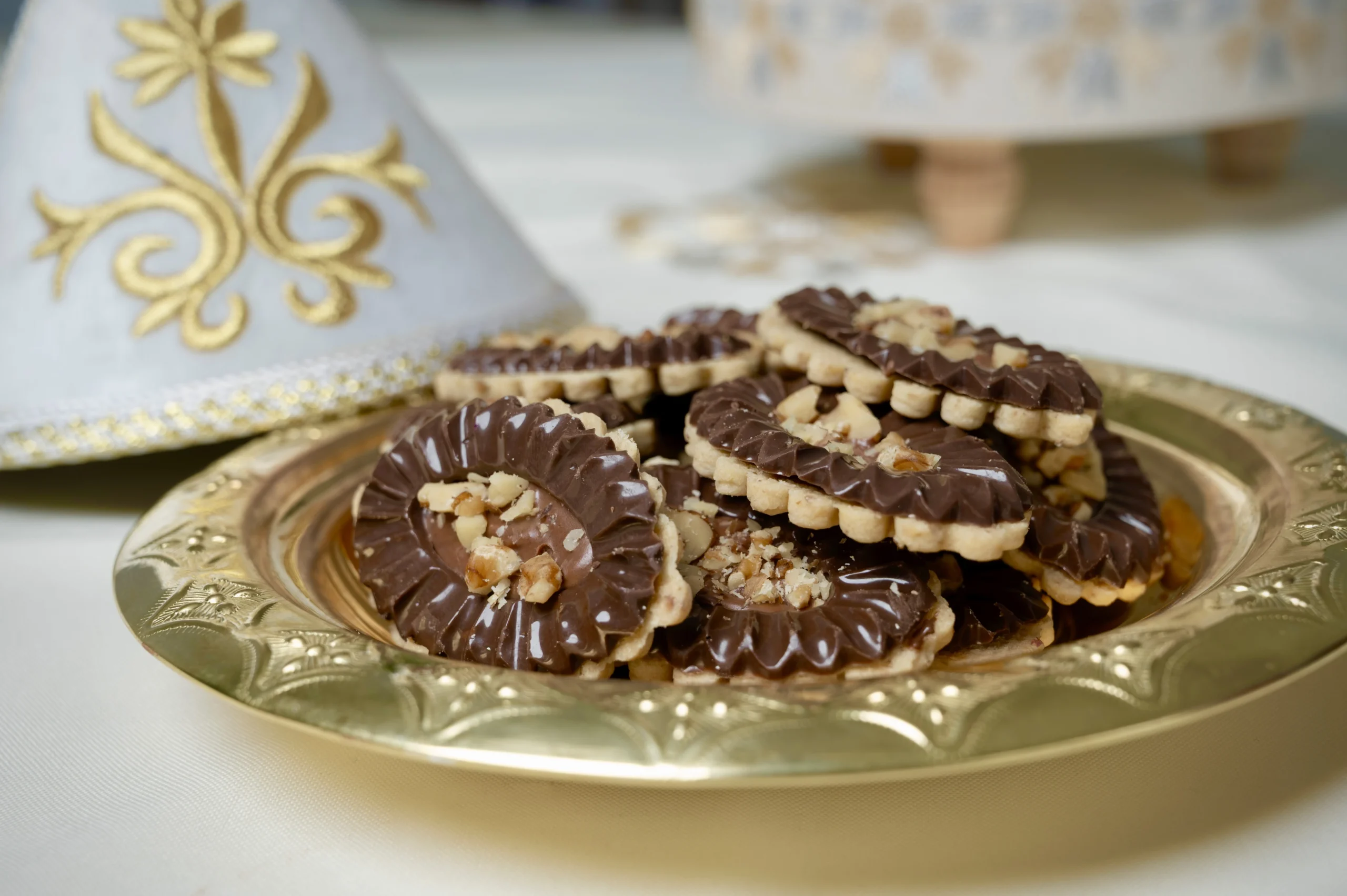 A rich, buttery sablé cookie infused with crushed walnuts and topped with a layer of smooth dark chocolate. Finished with a sprinkle of toasted walnut pieces for added crunch and depth of flavor.